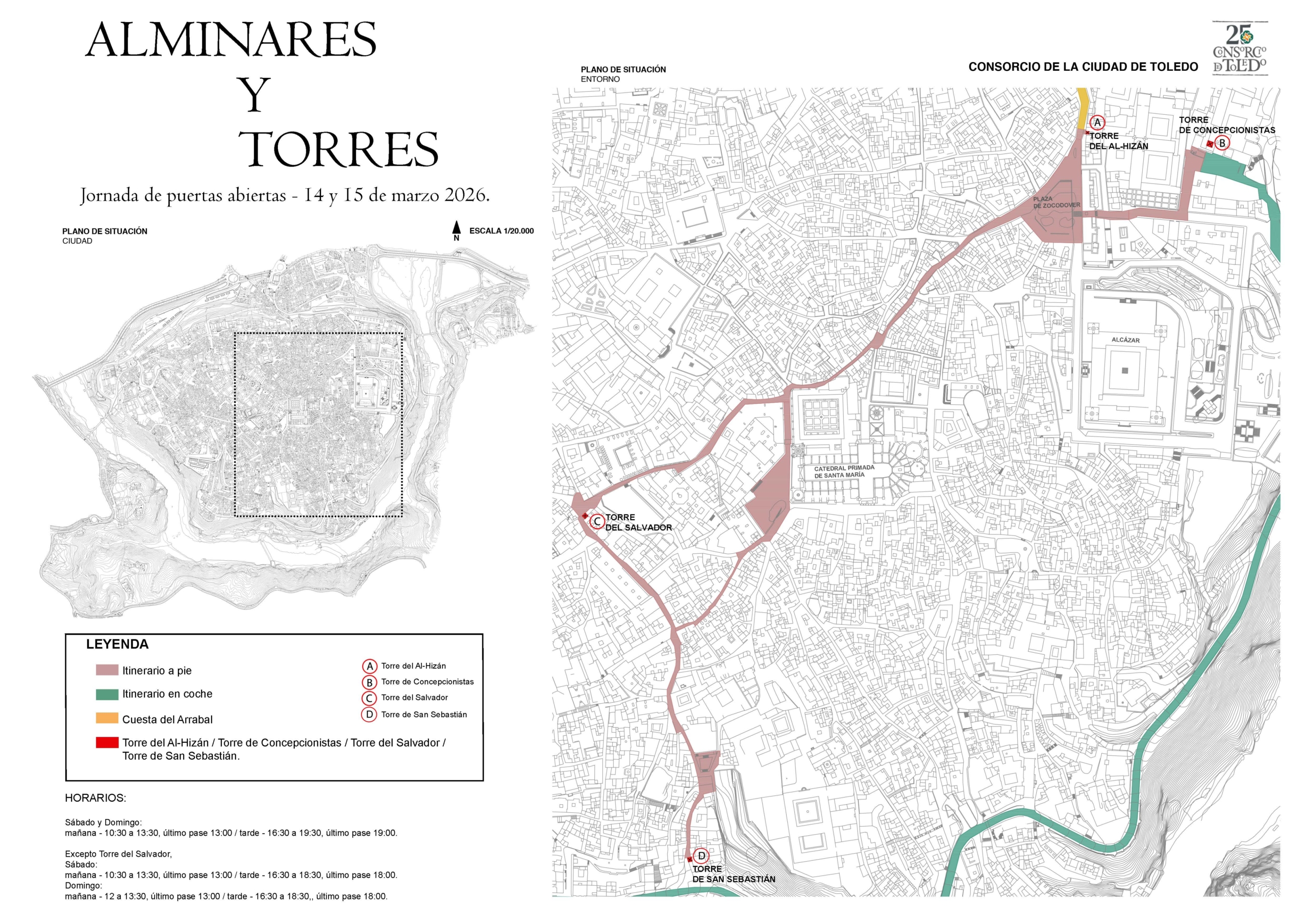 Tras 25 años de intervenciones en el patrimonio cultural de la ciudad, el Consorcio considera fundamental compartir con la ciudadanía el trabajo realizado, tanto con los habitantes de Toledo como con quienes visitan la ciudad. Por ello, estas jornadas abre sus puertas a estos cuatro espacios singulares: la torre del Al-Hizán; la torre-alminar de la iglesia de Iglesia de El Salvador; la torre del Convento de las Concepcionistas, y la torre de la Iglesia de San Sebastián.