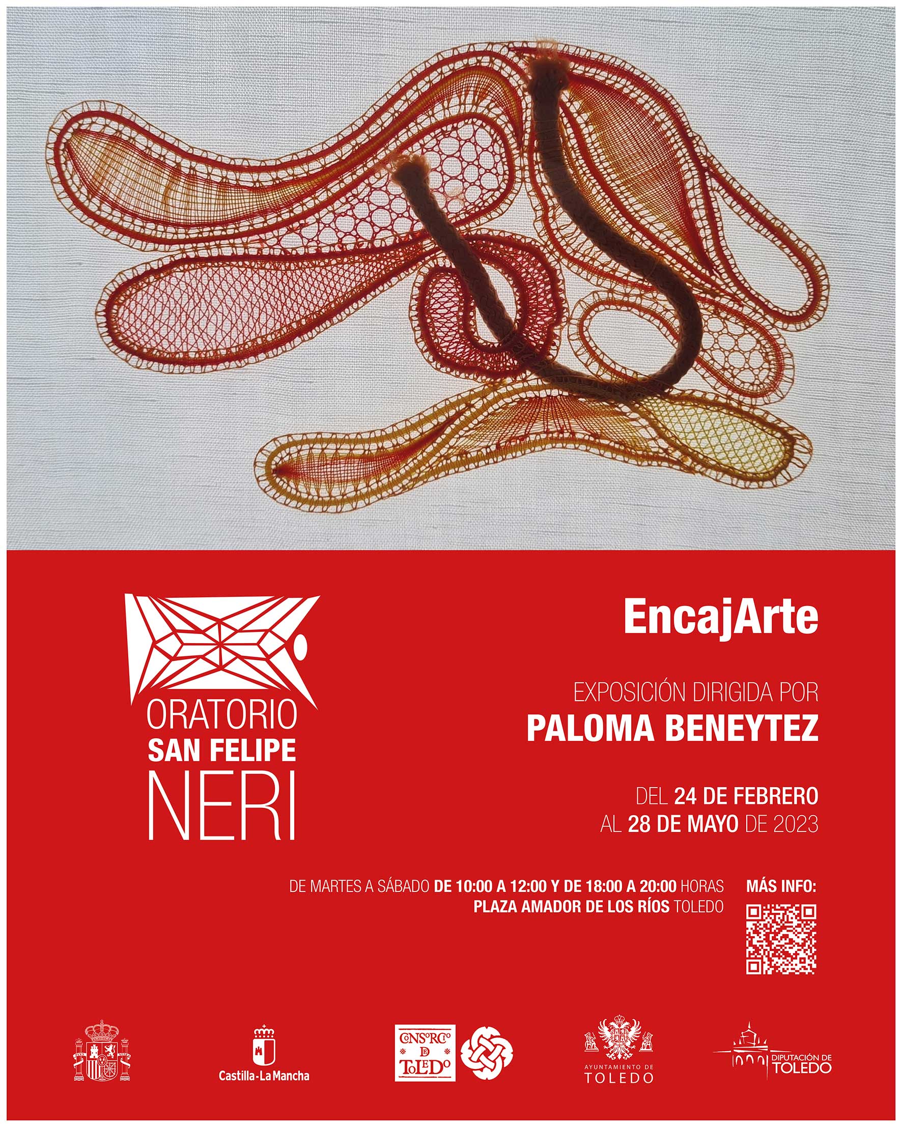 Cartel EncajArte La mujer en el arte textil‘EncajArte’ es una exposición colectiva que se puede visitar del 24 de febrero al 28 de mayo de 2023 en el oratorio de San Felipe Neri en Toledo y nos propone un recorrido estético y técnico por el encaje contemporáneo. Tiene una clara intención de contar lo que es el encaje en la actualidad con la evolución estilística a lo largo de este siglo.
